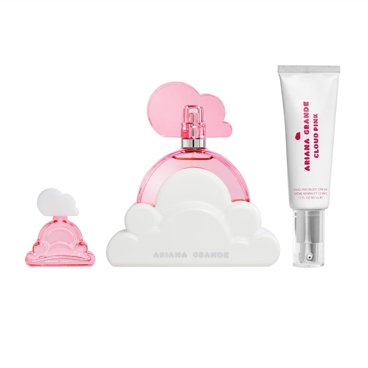 ¡Mantén los pies en la tierra pero la cabeza en las nubes! Este set de regalo Cloud Pink de Ariana Grande es un artículo imprescindible, ya que incluye la fragancia Cloud Pink, una lujosa crema para manos y cuerpo y un perfume metálico en aerosol de edición limitada.